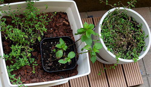 ミントとクリーピングタイムは寄せ植えにした。ミントは根が伸びすぎないように、小さめのプラスチックのカップに入れ、大き目の鉢に埋め込み、周囲にクリーピングタイムを植えた。